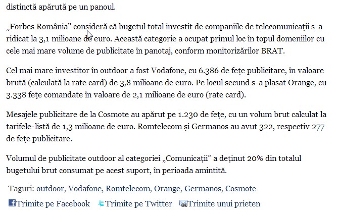 Operatorii de comunicații au fost cei mai activi clienți publicitari în outdoor, în anul 2012. „Forbes România” estimează că bugetul alocat panotajul de către piața telecom a fost de 3,1 milioane de euro. Vodafone a avut peste 6.300 de fețe publicitare.