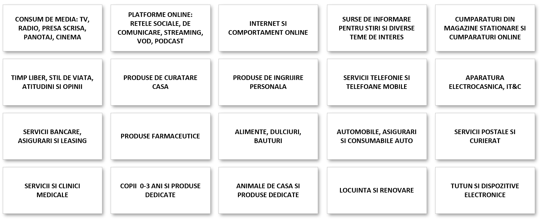 - Consumul media si cross media pentru toate canalele traditionale si a platformelor de media online: social media, platforme de streaming audio-video, vod, podcast - fiind masurate in total peste 200 de produse media.