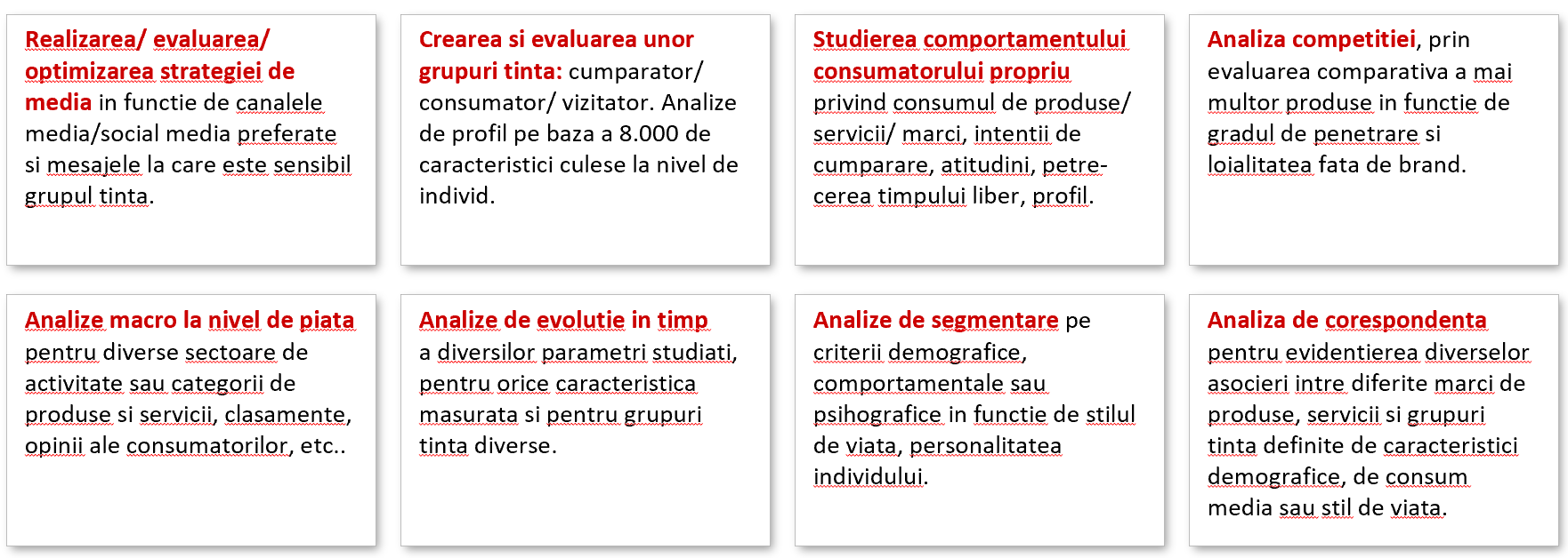 - UNICITATE - singurul studiu care colecteaza, de la acelasi respondent, informatii complete despre consumul de media, consumul de bunuri si servicii, preferinte, atitudini si stil de viata