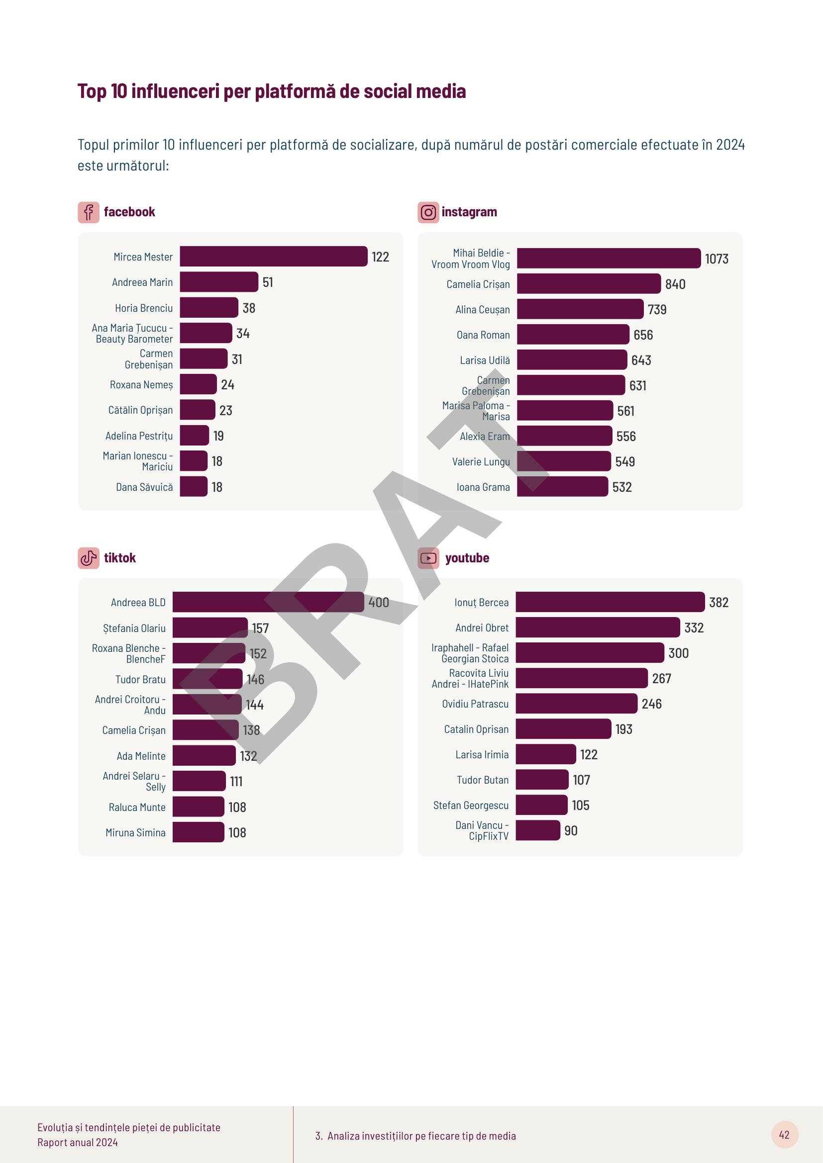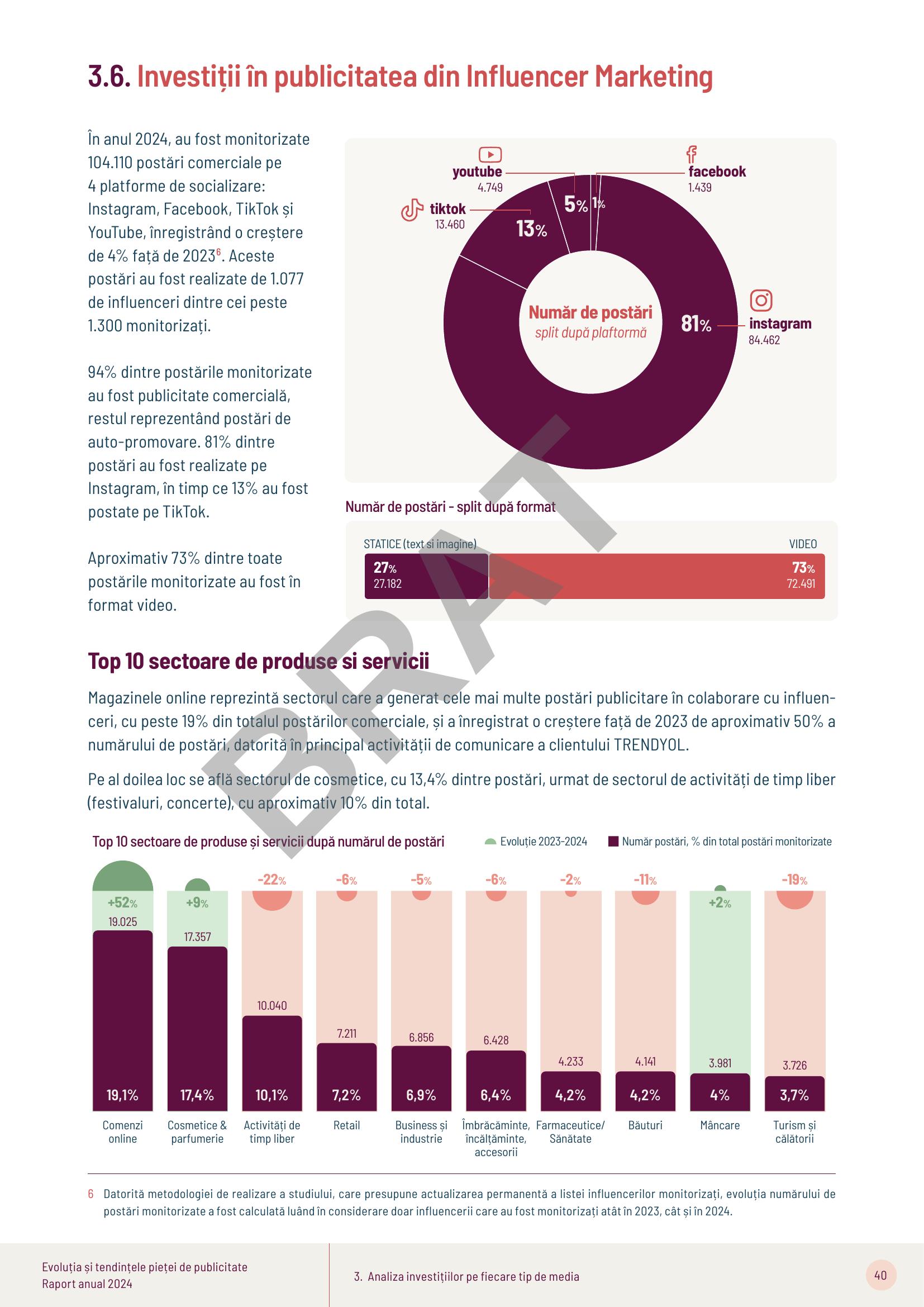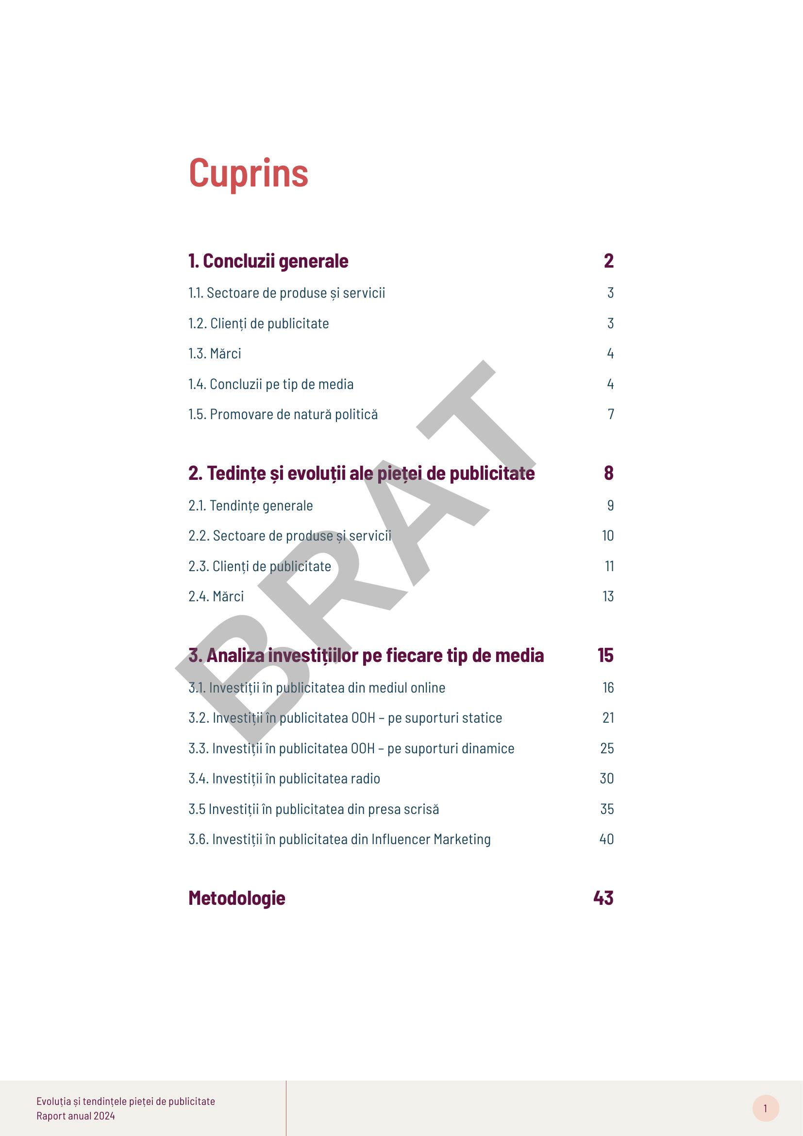 Raportul „Evolutia si tendintele pietei de publicitate” ofera o analiza completa a investitiilor in publicitate din Romania, evaluate la preturi de lista rate-card. Documentul detaliaza distributia bugetelor pe principalele medii de comunicare — online, OOH, radio, presa scrisa si influencer marketing — precum si pe sectoare economice, clienti si marci si produse media. De asemenea, raportul evidentiaza tendintele de crestere, scadere si diversificare a investitiilor pe fiecare canal media, incluzand comparatii fata de anul anterior.