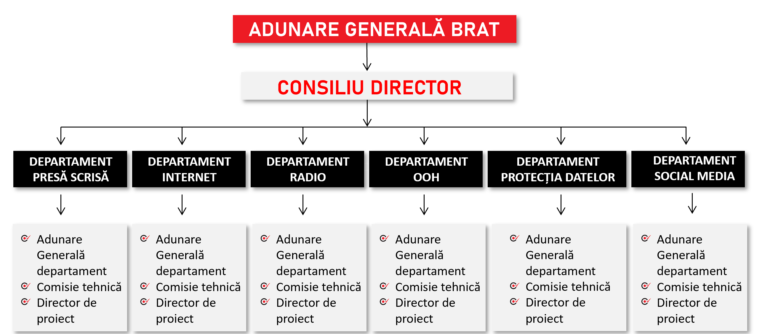 BRAT este organizata pe departamente fiecare dintre acestea avand organele de conducere proprii.